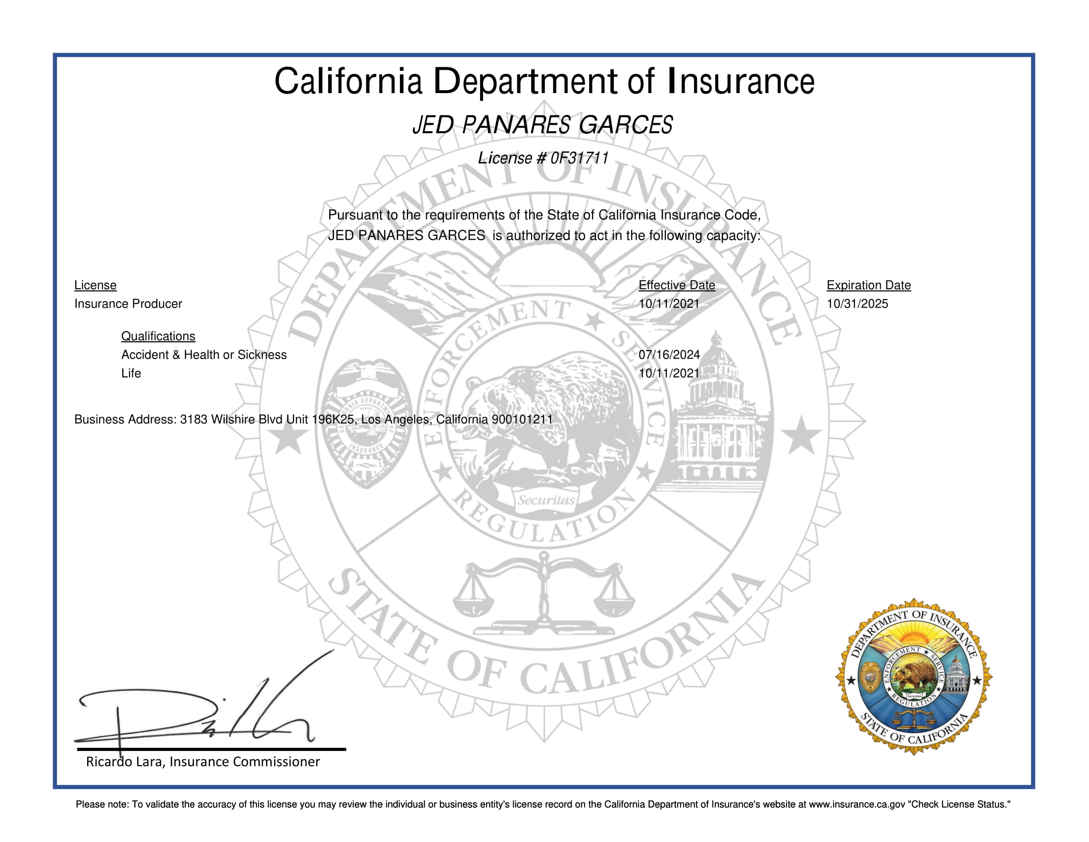 Jed Garces is a fully credentialed insurance professional, licensed by the California Department of Insurance (CDI). This license is one of the most rigorous in the nation, requiring a deep commitment to consumer protection, ethical conduct, and transparent financial planning.