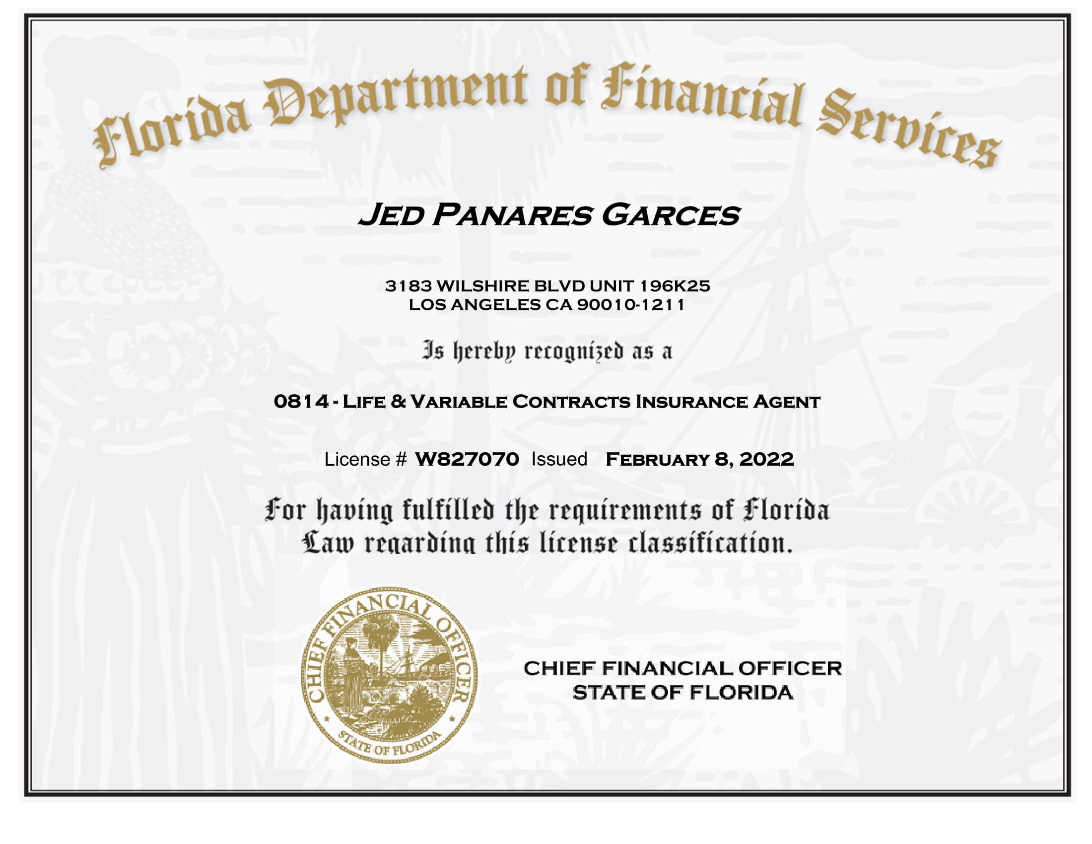 Jed Garces is a fully credentialed insurance professional, licensed by the Florida Department of Financial Services (DFS). This license is a testament to Jed’s commitment to the rigorous ethical and educational standards required to protect Florida consumers.